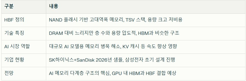 HBF는 낸드 플래시(NAND flash) 메모리를 기반으로 하는 차세대 고대역폭 메모리 기술로, HBM과 유사하게 실리콘 관통 전극(TSV) 기술을 활용해 여러 개의 칩을 수직으로 쌓아 높은 대역폭을 구현한다. HBF가 차세대 기술로 주목받는 배경에는 AI 추론 시대에 폭증하는 데이터 저장 용량의 한계를 극복해야 하는 산업적 요구가 자리하고 있다.