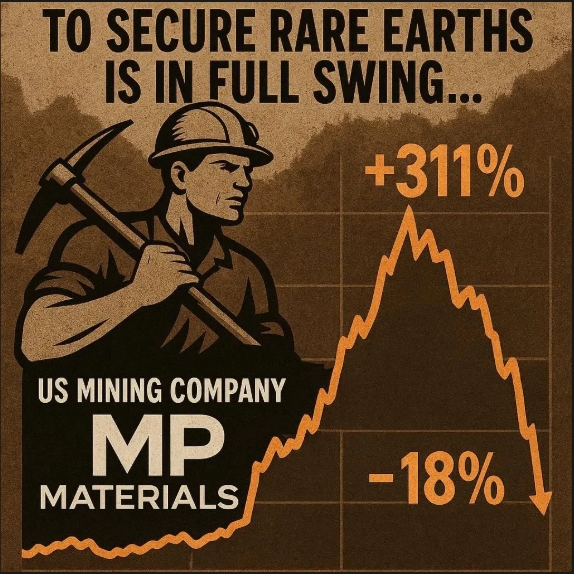 서반구 최대 희토류 광산업체인 MP 머터리얼즈 주가는 올해 들어 11일 거래 전까지 311% 올랐다. 그러나 최근 한 달간 18% 떨어지며 조정 국면에 들어갔다. 11일 뉴욕증시에서 MP 주가는 전날보다 3.5% 하락한 61.95달러에 거래를 마쳤다. 이틀 전 24% 급등한 데 따른 차익실현 매물이 나왔다.