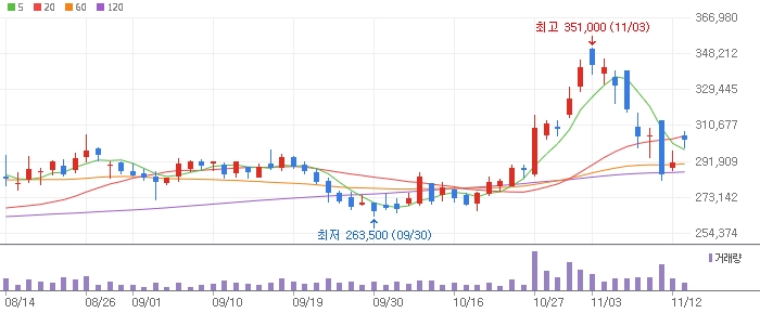 이미지 확대보기13일 한국거래소에 따르면, 오전 10시 30분 현재 하이브는 전거래일 대비 4.73%(1만3750원) 오른 30만5000원에 거래되고 있다.