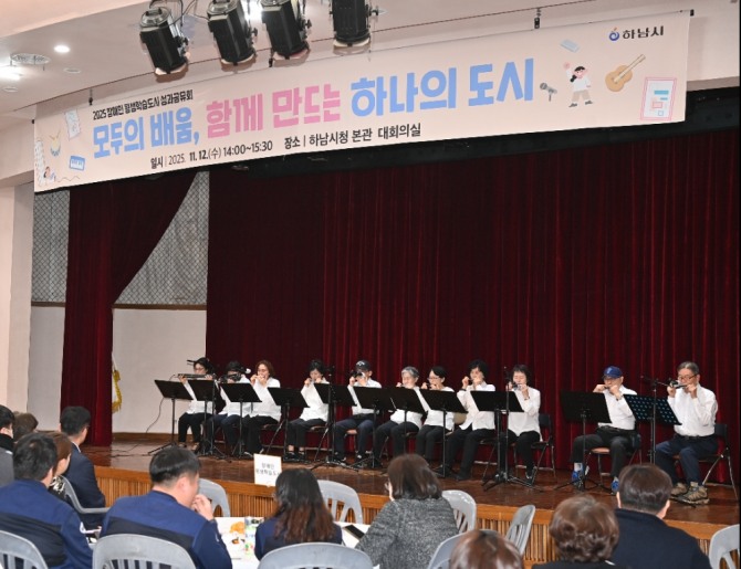 지난 12일 하남시장애인복지관 학습자들이‘2025 장애인 평생학습도시 성과공유회’에서 하모니카 연주를 선보이고 있다. 사진=하남시 이미지 확대보기