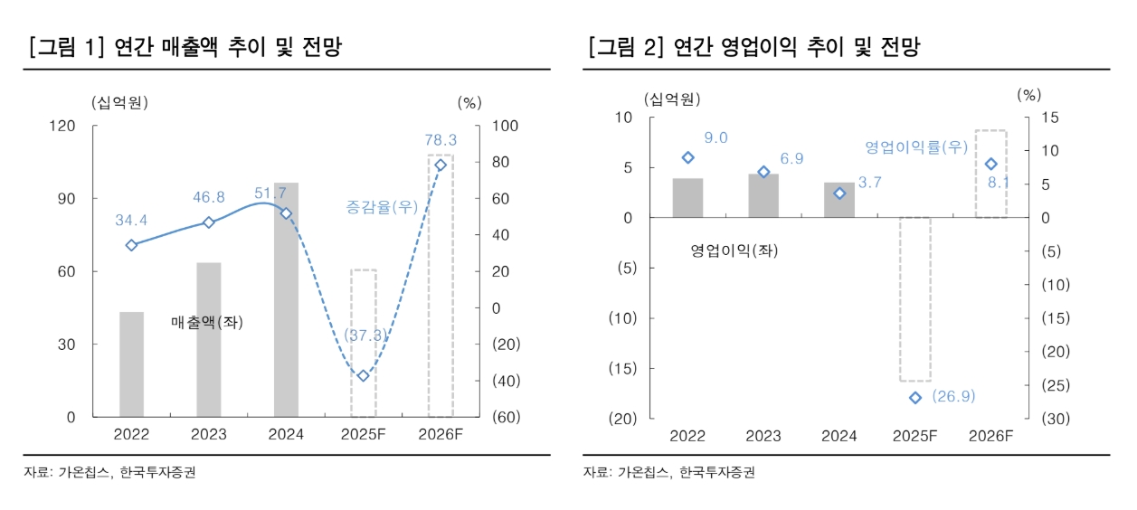 조 연구원은 "해당 레퍼런스를 바탕으로 앞으로 더 많은 개발 과제 수주가 가능할 것"이라며 다만, 가온칩스의 2025년 매출액은 전년 대비 37% 감소한 605억원, 영업적자는 162억원으로 단기 부진은 불가피할 것으로 보이는 가운데 4분기를 기점으로 2026년엔 매출액은 전년 대비 78% 증가한 1078억원, 영업이익은 흑자 전환한 87억원으로 큰 폭의 개선이 이뤄질 것"이라고 내다봤다.