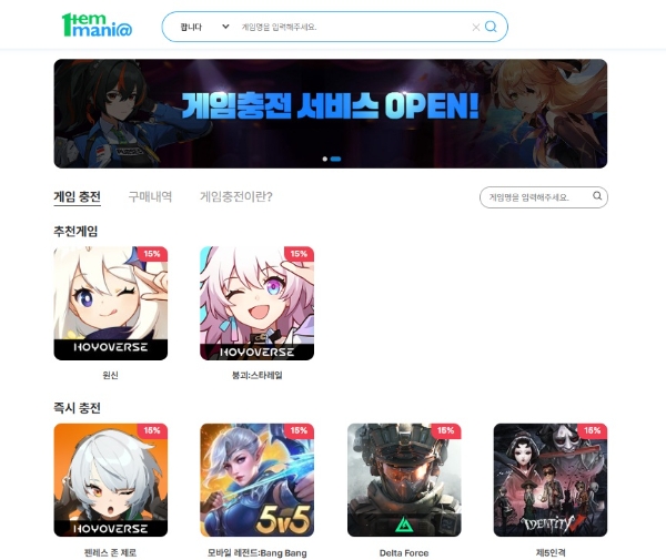 이미지 확대보기게임충전 서비스는 인앱 결제보다 할인된 가격에 게임 재화, 상품 등을 구매할 수 있도록 하는 서비스다. 싱가포르 결제 서비스 기업 '코다(Coda)'와 협력해 6개 인기 외산 게임을 지원한다.