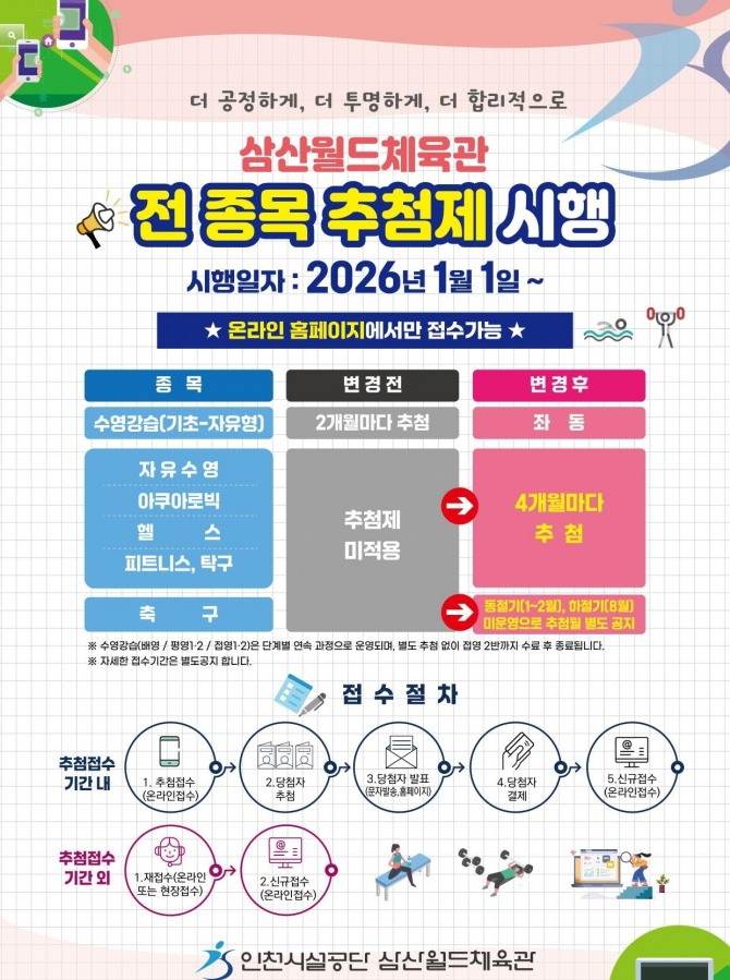 그동안 체육시설 프로그램은 접수 첫날마다 서버 접속 장애, 선착순 경쟁, 대기행렬 등 시민 불편이 반복됐다. 공단은 이를 개선하고자 기존회원 재등록 제도를 폐지하고 완전 추첨제로 전환, 이용 기회의 공정한 배분을 목표로 한다.