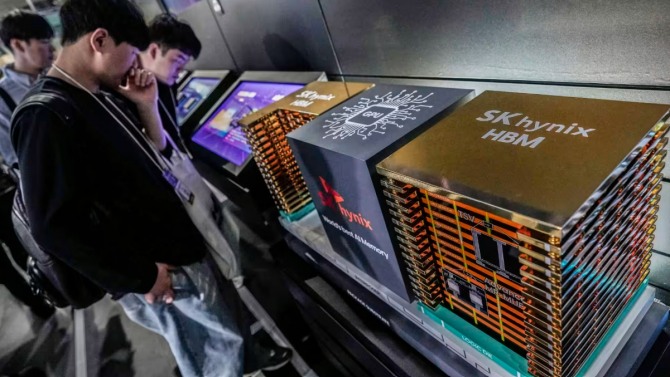 고대역폭 메모리는 여러 계층의 DRAM을 쌓아 AI 컴퓨팅에 더 빠른 연결과 전송 속도를 제공한다. 사진=AP/뉴시스이미지 확대보기