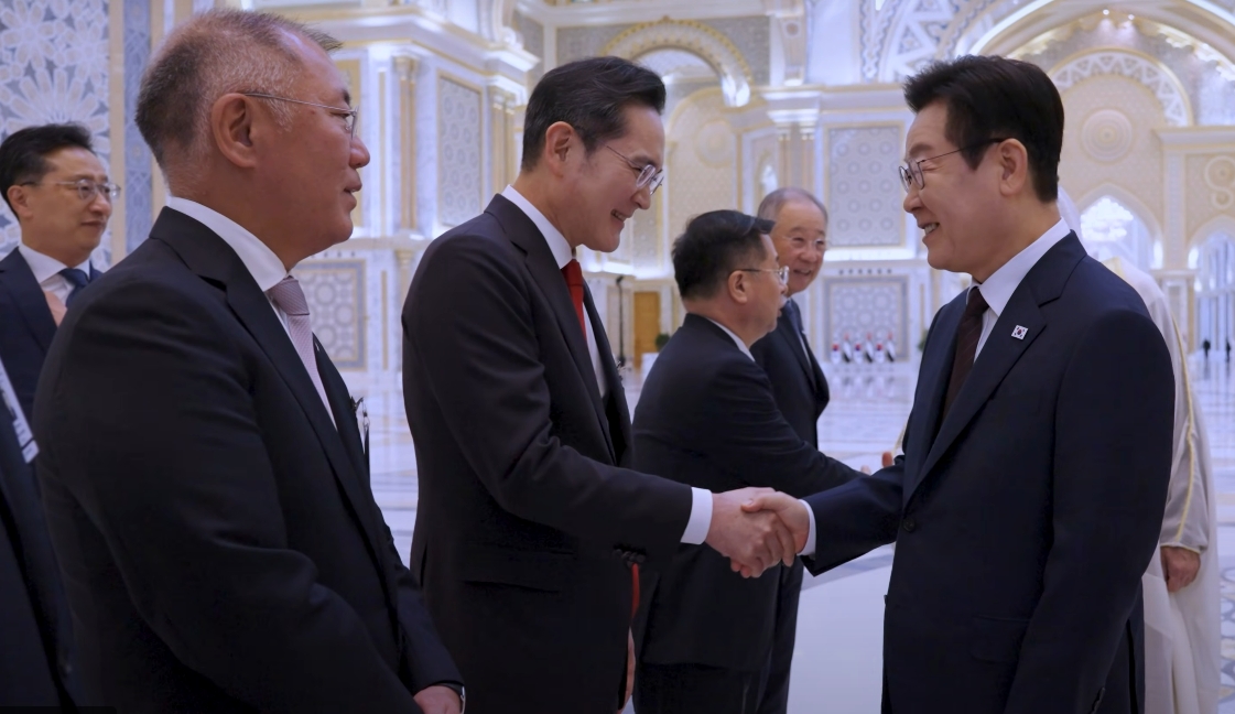 정의선 현대차그룹 회장과 이재용 삼성전자 회장, 이재명 대통령(앞줄 왼쪽부터)이 UAE에서 인사하고 있다. 사진=대통령실 영상 캡처