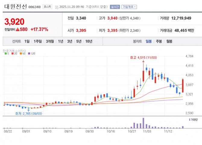 이미지 확대보기20일 한국거래소에 따르면 오전 9시46분 기준 거래소에서 대원전선은 전 거래일 대비 17.37% 오른 3920원에 거래 중이다. LS ELECTRIC 6.11%, 가온전선 6.76%, HD현대일렉트릭 4.6%, 대한전선6.96%, 효성중공업 2.87%, 일진전기 2.49% 등이 동반 상승 중이다.