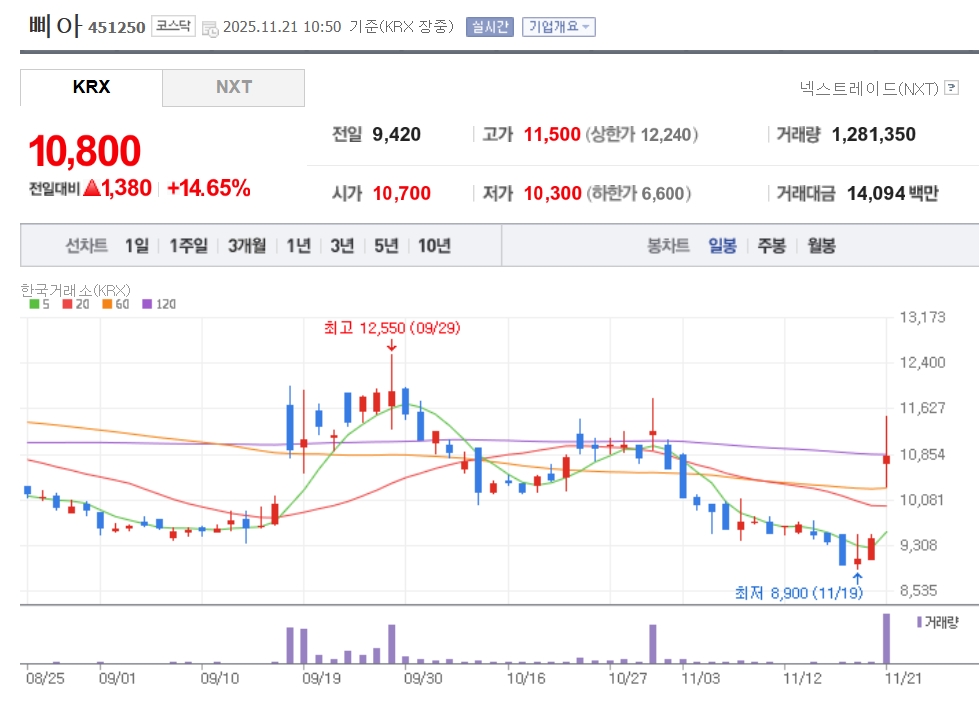 이미지 확대보기21일 한국거래소에 따르면 이날 오전 10시 50분 기준 삐아는 전 거래일 대비 14.65% 오른 1만 800원에 거래되고 있다.