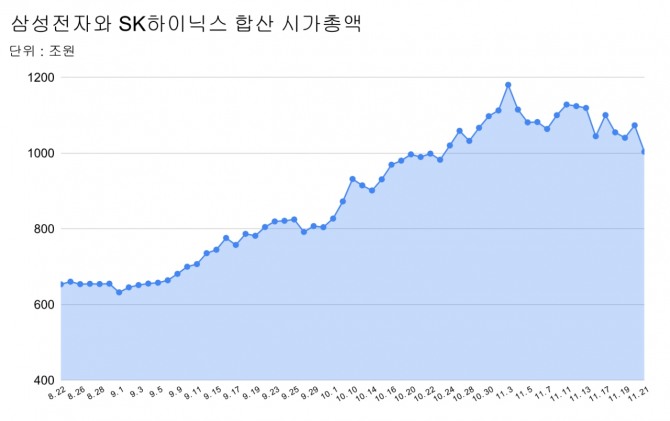 삼성전자·삼성전자우·SK하이닉스 등 반도체 투톱 종목의 합산 시가총액은 이날 현재 하루 동안 69.9조원 감소한 상황이다. 이들 3 종목의 합산 시가총액은 1003조원으로, 1000조원선 초반 까지 밀려났다. 이달 3일 기록했던 최고점 1179.9조원 대비로는 약 177조원 감소한 수준이다.