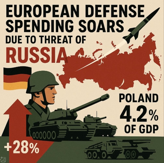 독일은 국방비를 28% 증가시켜 885억 달러(약 130조 원)를 기록했으며, 이는 중서부 유럽 최대 규모이자 세계 4위 수준이다. 폴란드는 31% 증가한 380억 달러(약 55조 원)를 국방에 투입했으며, 이는 국내총생산(GDP)의 4.2%에 해당한다. NATO는 회원국들에게 GDP의 2%를 국방비로 지출할 것을 권고하고 있으나, 폴란드는 이를 두 배 이상 초과했다.