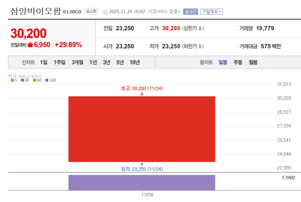 이미지 확대보기24일 한국거래소에 따르면 삼양바이오팜은 이날 오전 10시 7분 기준으로 29.89% 오른 상한가인 3만 200원에 거래되고 있다.