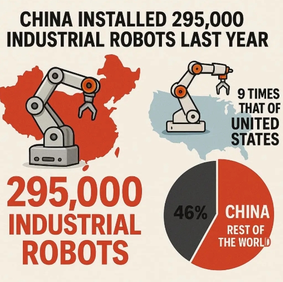 국제로봇연맹(IFR) 통계에 따르면 중국의 운영 중인 산업용 로봇은 지난해 200만대를 넘어섰다. 이는 단일 국가로는 세계 최대 규모다. 중국이 지난해 설치한 로봇 295000대는 전 세계 다른 국가들을 모두 합친 것보다 많다.