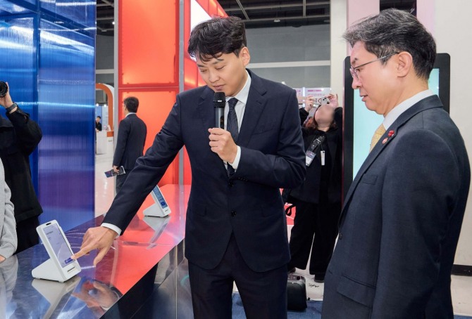 11월 26일 ‘코리아 핀테크 위크 2025’ 토스 부스에서 비바리퍼블리카 이승건 대표(왼쪽)가 이억원 금융위원장(오른쪽)에게 토스 단말기 및 페이스페이 서비스를 소개하는 모습 사진=토스이미지 확대보기