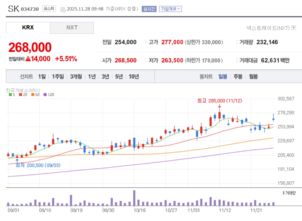 이미지 확대보기28일 한국거래소에 따르면 오전 9시 48분 기준 SK는 전일 대비 5.51% 오른 26만800원에 거래되고 있다.