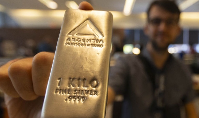 2024년 10월4일 캐나다 토론토에서 열린 코인 엑스포에서 한 딜러가 은괴를 보여주고 있다. 사진=신화/뉴시스