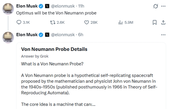 머스크는 이날 새벽 자신의 소셜미디어 X에 올린 글에서 “옵티머스는 폰 노이만 탐사선이 될 것”이라는 짧은 글을 남겼다. 이는 테슬라가 기존 방식이 아닌 옵티머스가 자기 자신을 복제하는 시스템을 통해 생산 목표를 달성할 수 있다는 뜻으로 해석된다.