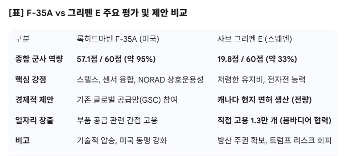 평가단은 임무 수행 능력, 향후 업그레이드 가능성, 기술적 지속 가능성 등 5개 항목 모두에서 F-35가 그리펜을 앞섰다고 분석했다. 특히 스텔스 기능과 센서 융합 능력을 바탕으로 한 임무 수행 분야에서 격차가 가장 컸다.