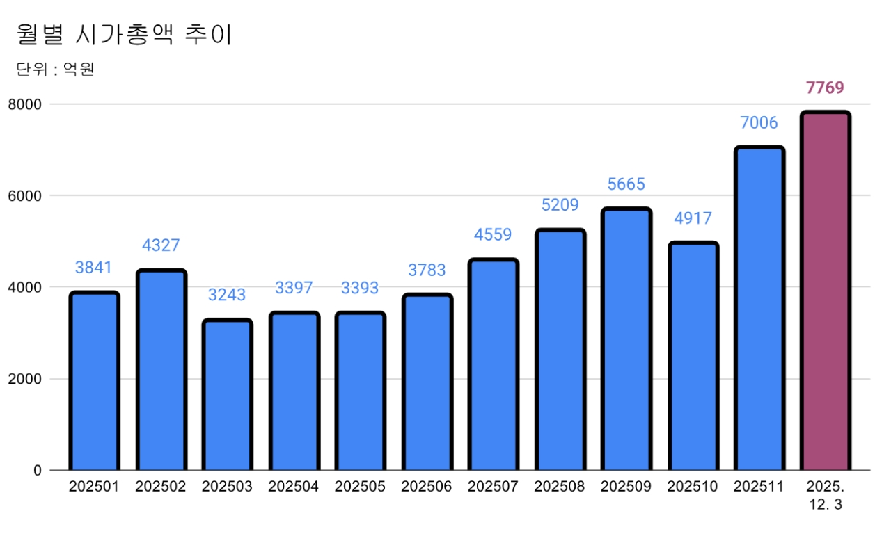 종가 기준 시가총액은 7769억원으로 8000억원 돌파를 앞두고 있다. 이날 하루동안 131억원 증가했다.