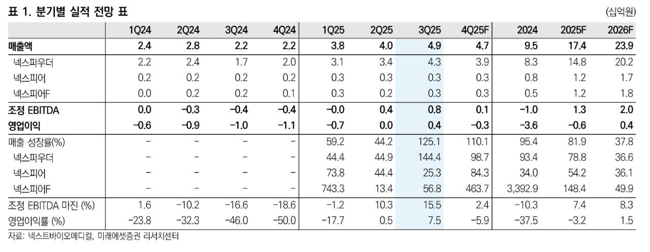 미래에셋증권 보고서에 따르면 넥스트바이오메디컬의 2025년 3분기 매출액은 49억 원으로, 전년 동기 대비 125% 성장하며 또다시 사상 최대 분기 매출을 갱신했다.