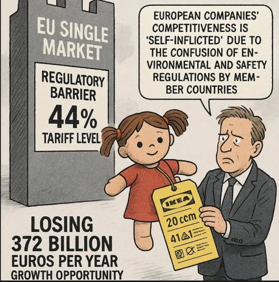 EU 단일시장의 규제 비효율을 가장 잘 보여주는 사례로 이케아의 '융엘스코그(Djungelskog)' 코끼리 봉제인형이 꼽힌다. 높이 12cm에 불과한 이 인형 뒤편에는 무려 20cm 길이의 라벨이 달려 있다. 프랑스 환경 규정과 EU 섬유 관련 법률이 이 긴 라벨의 주된 원인이다.