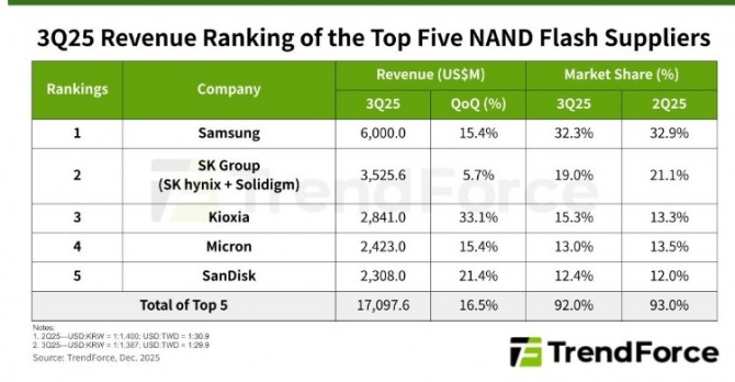 2025년 3분기 낸드 플래시 매출 및 시장 점유율. 사진=트렌드포스 이미지 확대보기