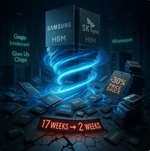 이미지 확대보기전 세계 메모리 반도체 시장이 전례 없는 '이중 옥죄기(double squeeze)'에 직면했다. 인공지능(AI) 열풍이 촉발한 고대역폭메모리(HBM) 수요 폭증으로 반도체 제조사들이 생산 라인을 대거 재편하자, 역설적으로 PC와 스마트폰에 들어가는 범용(Legacy) 메모리 공급이 끊기는 사태가 벌어진 것이다. 일부 제품 가격은 지난 2월 이후 두 배 이상 폭등했으며, D램 재고는 바닥을 드러내고 있다. 마이크로소프트(MS), 구글 등 빅테크 기업들은 "가격은 묻지 않을 테니 물량만 달라"며 공급사 앞에 줄을 섰고, 스마트폰 제조사들은 소비자 가격의 최대 30% 인상을 경고하고 나섰다. 단순한 부품 부족을 넘어 글로벌 거시경제(Macroeconomy)를 위협하는 인플레이션 요인으로 비화하고 있다는 진단이 나온다.