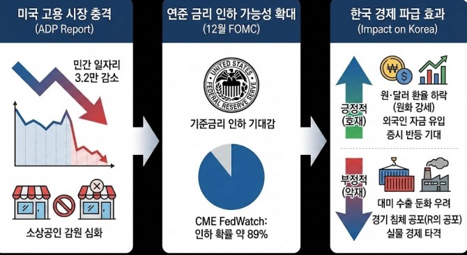 하지만 실물 경제, 특히 수출 전선에는 '빨간불'이 켜졌다. 미국의 민간 고용 감소는 곧 미국 소비자의 지갑이 닫힌다는 뜻이다. 한국의 최대 수출 시장인 미국의 소비 위축은 자동차(현대차·기아), 반도체(삼성전자·SK하이닉스), 가전 등 주력 수출 품목의 실적 악화로 직결될 수 있다.