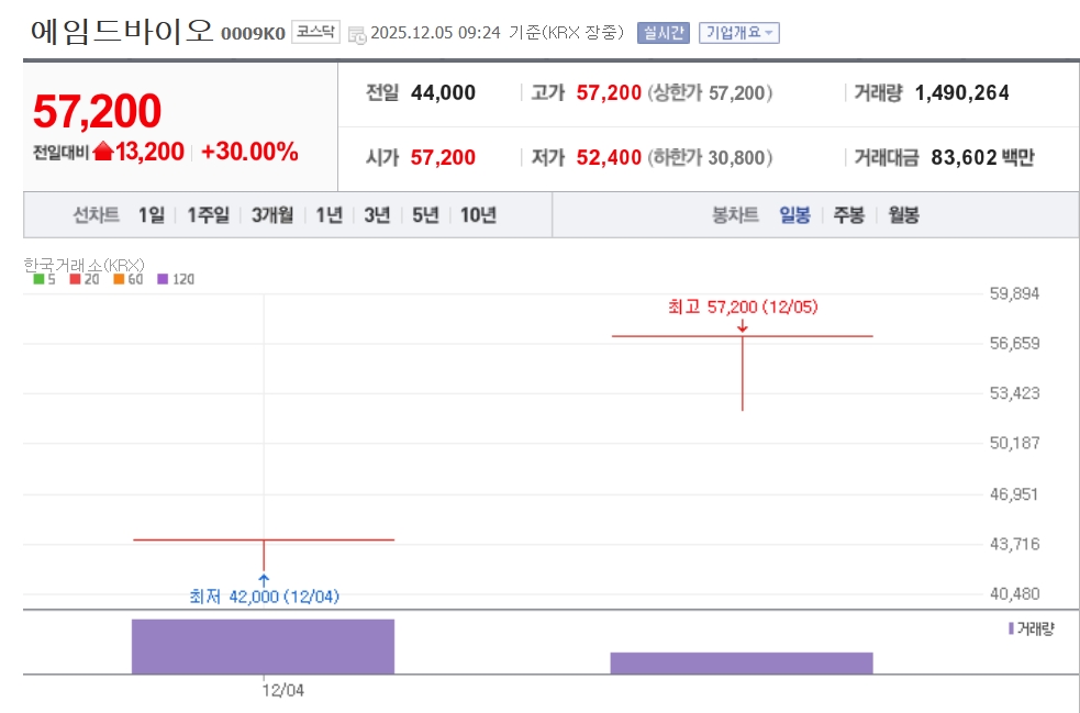 이미지 확대보기5일 한국거래소에 따르면, 에임드바이오는 오전 9시 24분 기준으로 전 거래일 대비 30.00% 오른 5만 7200원 상한가에 거래되고 있다. 앞서 상장 첫날인 전날(4일)에는 ‘따따블’(공모가 대비 4배 상승)을 달성했다.