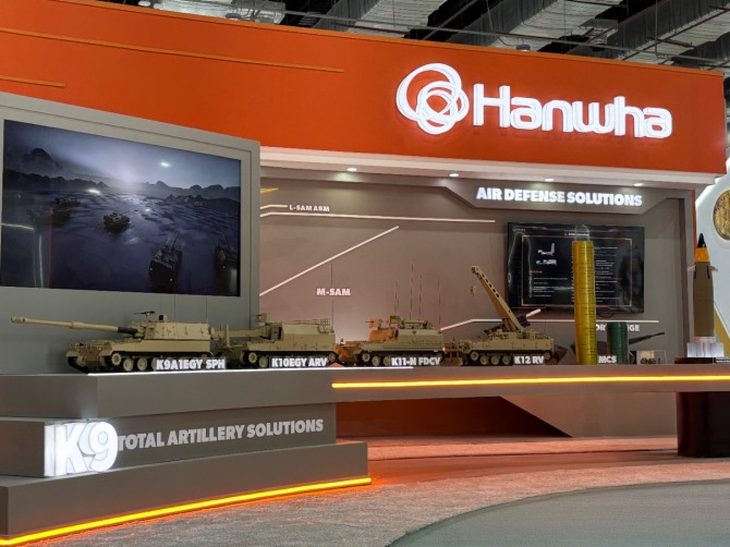 이집트 카이로에서 이달 1~4일까지 열리는 'EDEX 2025(이집트 방산 전시회)' 한화 부스에 전시된 'K9 자주포' 패키지 모형.사진=한화에어로스페이스