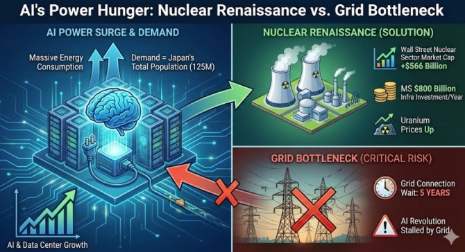 인공지능(AI) 기술의 폭발적 성장이 전례 없는 전력 수요를 촉발하며 글로벌 증시에서 원자력 발전이 유일한 대안으로 급부상한 가운데, 노후화된 전력망(Grid)이 AI 혁명의 최대 걸림돌이 될 것이라는 경고가 나왔다. 이미지=제미나이3