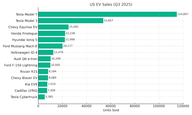 2025년 3분기 미국의 브랜드별 전기차 판매량. 사진=클린테크니카