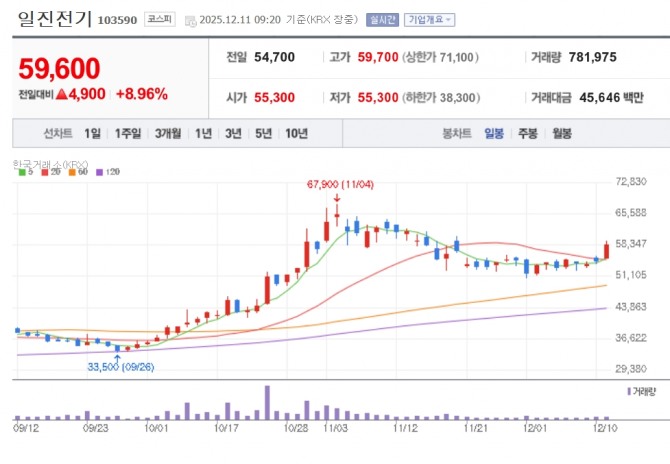 이미지 확대보기11일 한국거래소에 따르면 오전 9시20분 일진전기는 전 거래일 대비 8.96% 오른 5만9600원에 거래 중이다. 제룡전기(3.3%), 효성중공업(3.6%), 산일전기(2.49%), 가온전선(1.88%), HD현대일렉트릭(2.59%), 대한전선(1.56%) 등도 동반 강세다.