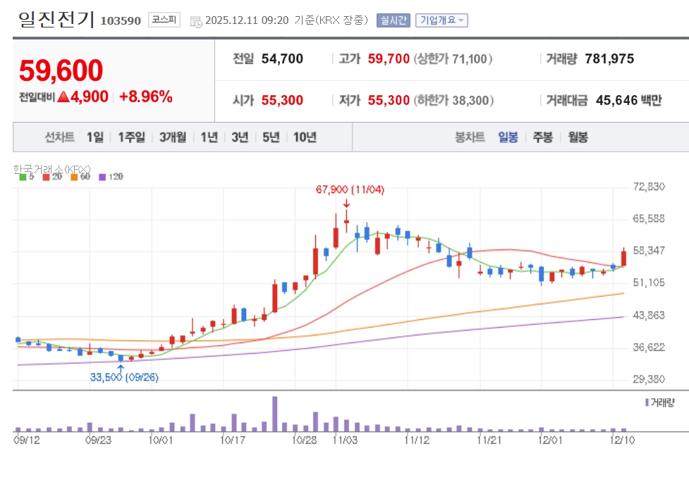 11일 한국거래소에 따르면 오전 9시20분 일진전기는 전 거래일 대비 8.96% 오른 5만9600원에 거래 중이다. 제룡전기(3.3%), 효성중공업(3.6%), 산일전기(2.49%), 가온전선(1.88%), HD현대일렉트릭(2.59%), 대한전선(1.56%) 등도 동반 강세다.