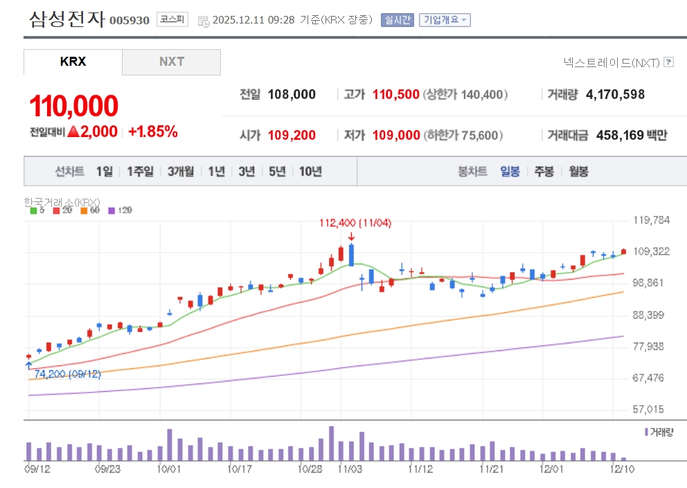 이미지 확대보기11일 한국거래소에 따르면 오전 9시28분 기준 거래소에서 삼성전자는 전 거래일 대비 1.85% 오른 11만에 거래 중이다.