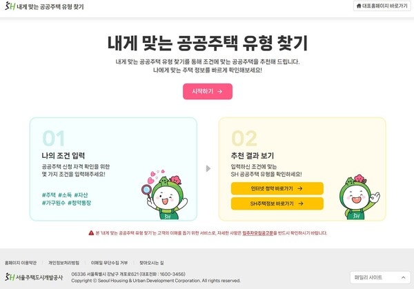 이미지 확대보기서울주택도시개발공사(SH)가 시민들이 자신의 자격 요건에 맞는 공공주택 유형을 손쉽게 확인할 수 있도록 누리집에 ‘내게 맞는 공공주택 유형 찾기’ 서비스를 새롭게 도입했다.