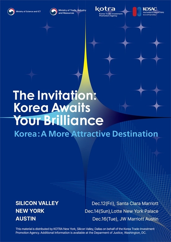 이미지 확대보기대한무역투자진흥공사(코트라)는 12~16일(현지시간) 미국 실리콘밸리·뉴욕·오스틴 등 3개 도시를 순회하는 대규모 인재 교류 로드쇼인 'The Invitation: Korea Awaits Your Brilliance'를 개최한다.