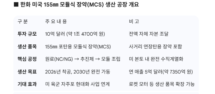 새로 들어설 미국 공장은 한화의 국내 핵심 생산기지인 여수 공장을 모델로 삼는다. 여수 공장은 현재 연간 약 120만 개의 장약 모듈을 생산하며, 2028년까지 이를 160만 개로 늘릴 계획이다. 충북 보은에 짓는 제2공장 역시 2027년 가동을 목표로 하고 있다.