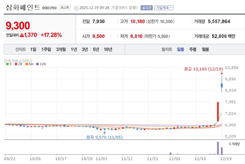 이미지 확대보기19일 한국거래소에 따르면 이날 오전 9시 28분 기준 삼화페인트는 전 거래일 대비 17.28% 오른 9300원에 거래되고 있다.