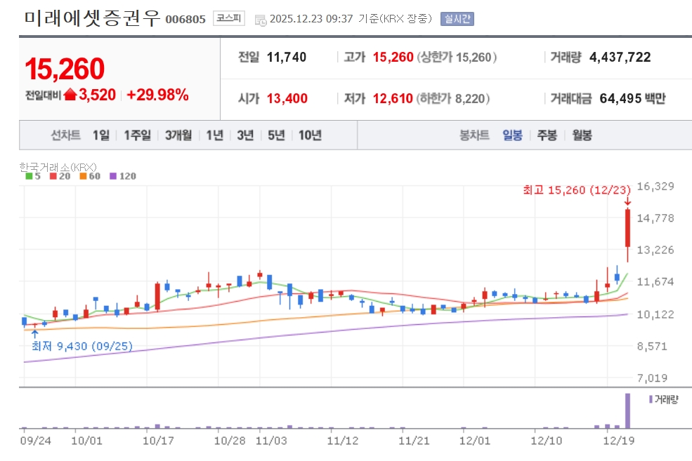 이미지 확대보기23일 한국거래소에 따르면 이날 오전 9시 37분 현재 미래에셋증권우는 전 거래일 대비 29.98% 오른 1만5260원에 거래되고 있다. 반면, 보통주인 미래에셋증권 주가는 3.26% 오른 2만3750원에 거래되고 있다.
