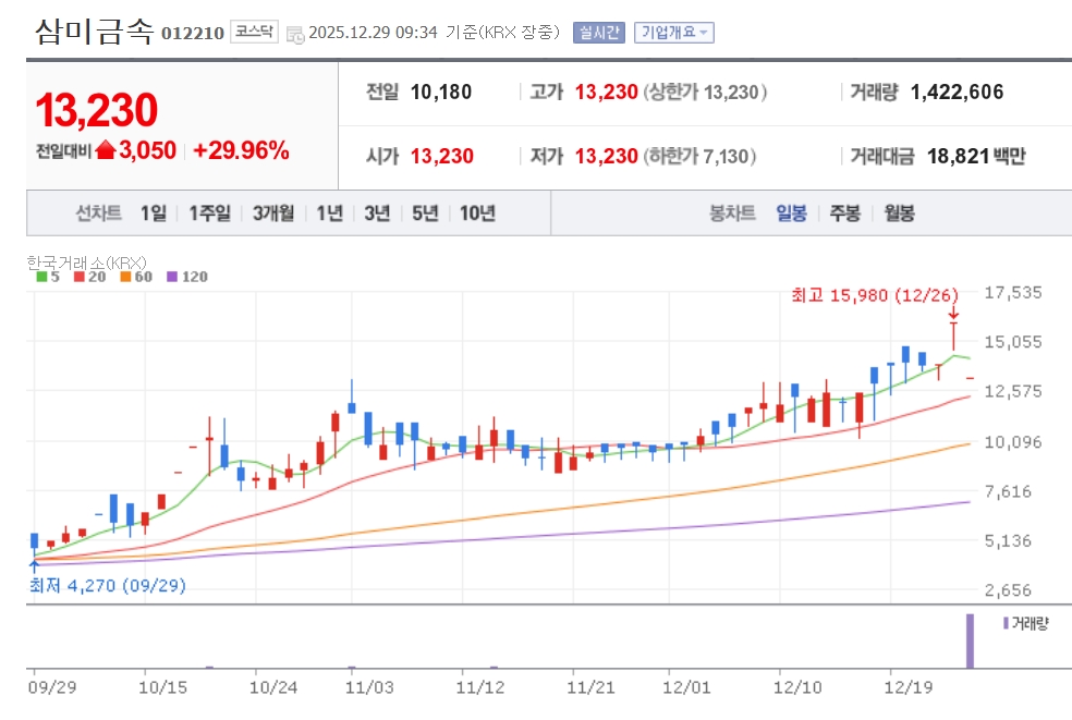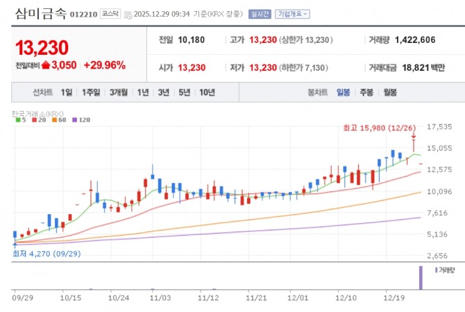 이미지 확대보기29일 한국거래소에 따르면 삼미금속은 이날 9시34분 현재 전 거래일 대비 29.96% 오른 1만3230원에 거래되고 있다.