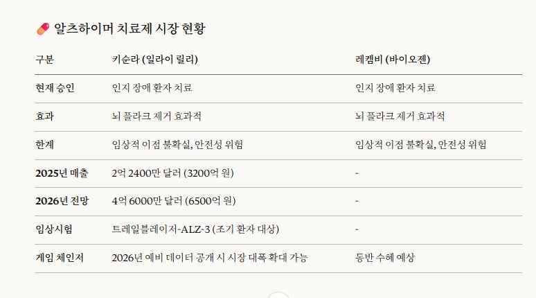 현재 키순라와 바이오젠의 레켐비는 이미 인지 장애를 겪는 환자 치료에 승인됐지만, 효과는 제한적이다. 두 약물 모두 뇌 플라크 제거에는 효과적이나 임상적 이점은 불확실하고 안전성 위험도 존재한다. 키순라 매출은 2025년 2억 2400만 달러(약 3200억 원), 2026년 4억 6000만 달러(약 6500억 원)에 그칠 전망이다.
