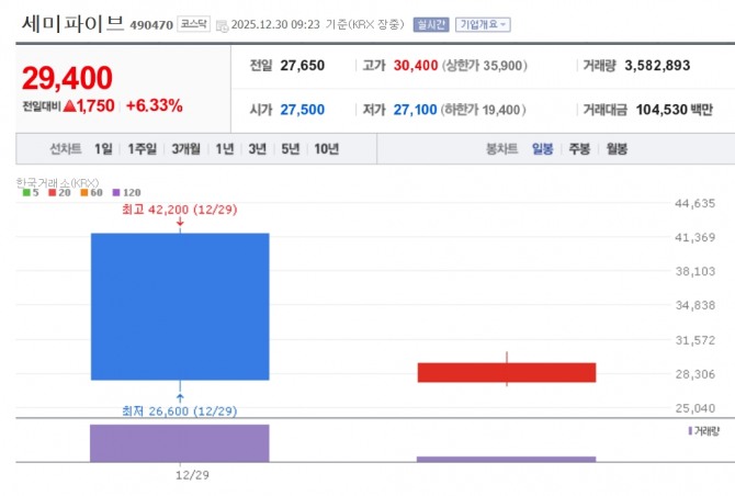 이미지 확대보기30일 한국거래소에 따르면 세미파이브는 이날 오전 9시23분 기준으로 전 거래일 대비 6.33% 오른 2만 9400원에 거래되고 있다. 앞서 전날(29일) 코스닥 시장에 상장한 세미파이브는 공모가(2만 4000원) 대비 15.21% 오른 2만 7650원에 거래를 마쳤다.