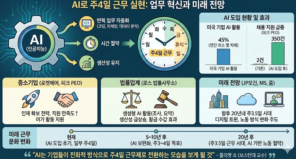 JP모건체이스 CEO 제이미 다이먼은 2025년 11월 한 경제포럼에서 "향후 20~30년, 심지어 40년 안에 AI가 근무 시간을 주당 3.5일로 줄일 것"이라고 전망했다. 그는 5일 사무실 출근 정책을 시행 중인 자신의 회사도 재교육, 인력 재배치, 조기 퇴직 제공을 검토해야 할 수 있다고 덧붙였다.