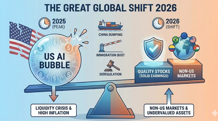 샤르마 회장은 현재의 AI 시장이 전형적인 버블 징후를 보인다고 진단했다. 미국 주식시장은 고평가됐고, 투자는 과열됐으며, 부채는 과도하다는 것이다. 특히 미국 가계 자산에서 주식이 차지하는 비중이 부동산을 넘어선 점을 우려했다.