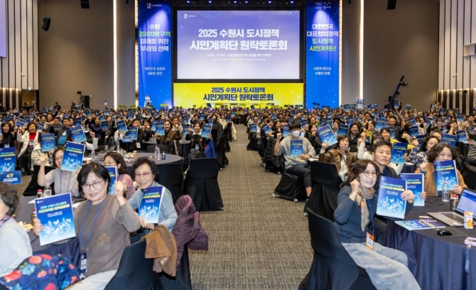 수원특례시 도시정책 시민계획단이 경제자유구역 원탁토론회를 진행하고 단체 기념촬영을 하고 있다. 사진=수원특례시