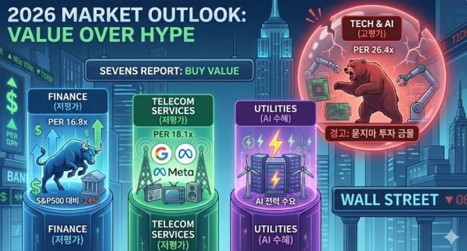 인공지능(AI) 열풍이 미국 증시 밸류에이션(기업 가치)을 천정부지로 끌어올린 가운데, 2026년 투자 시장의 승부처는 '화려한 기술주'가 아닌 '실속 있는 저평가주'가 될 것이라는 분석이 나왔다. 시장 과열 논란 속에서도 실적 대비 주가가 현저히 낮은 금융, 통신 서비스, 유틸리티 등 3개 업종이 올해 증시의 '숨은 진주'로 지목됐다.