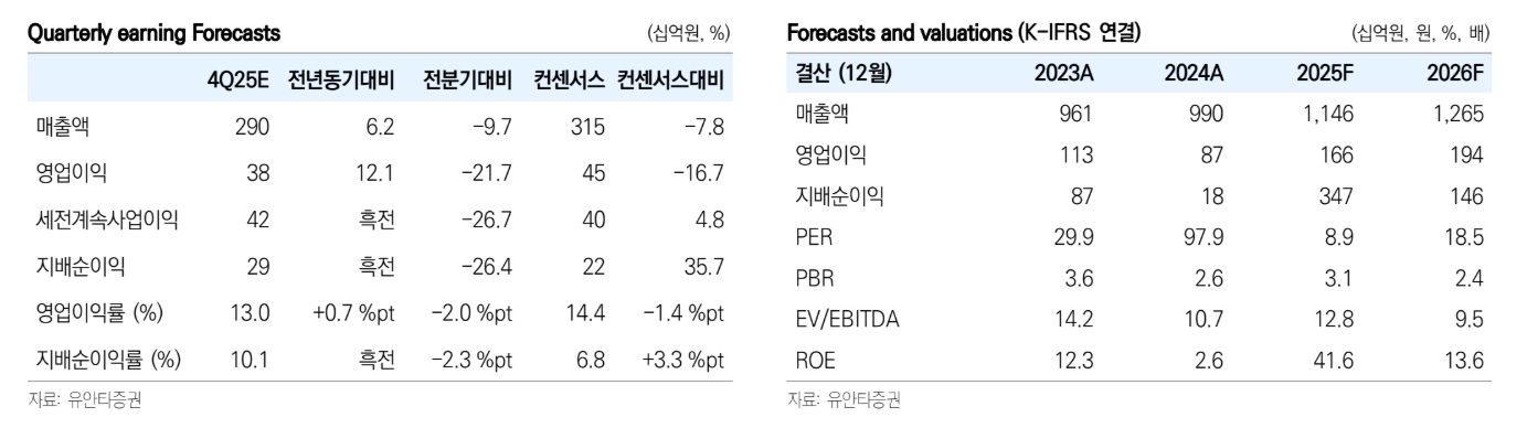 이미지 확대보기4Q25(2025년 4분기) 연결 기준 예상 매출액은 2905억원(전년 동기 대비 +6.1%), 영업이익은 377억원(+11.3%)으로 시장 컨센서스(매출액 3151억원, 영업이익 453억원)를 하회할 것으로 전망했다.