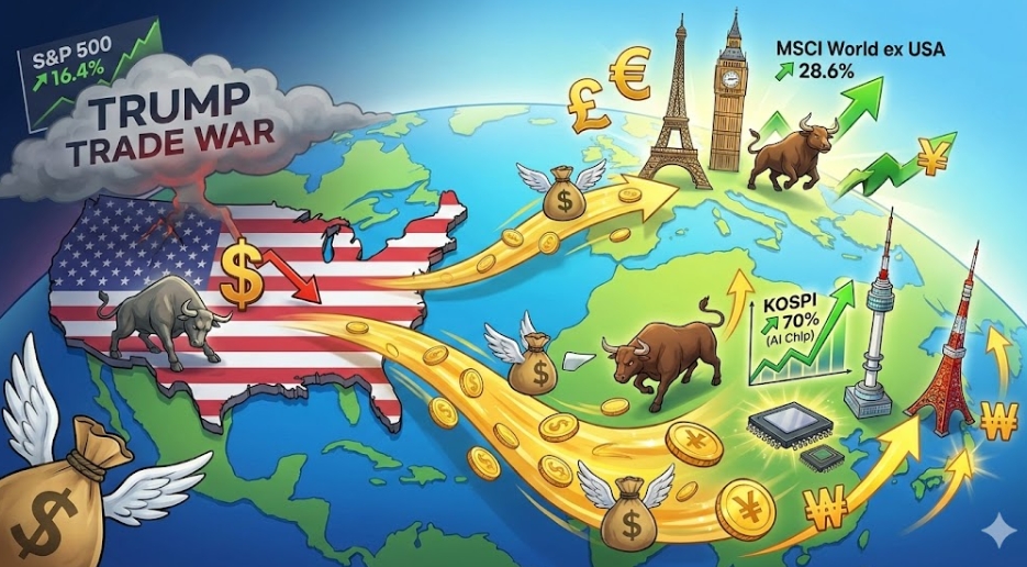 지난해 글로벌 증시는 뚜렷한 '탈동조화(Decoupling)' 흐름을 보였다. 미국 대형주를 대표하는 S&P 500 지수는 16.4% 상승하며 한 해를 마감했다. 통상적으로 훌륭한 성적표지만, 미국 밖 사정과 비교하면 이야기가 달라진다. 모건스탠리캐피털인터내셔널(MSCI)이 발표하는 미국을 제외한 전 세계 22개 선진국 시장의 대형 및 중형주 기업 750여 개로 구성된 'MSCI 월드 엑스(ex) USA 지수'는 같은 기간 무려 28.6%나 치솟았다.