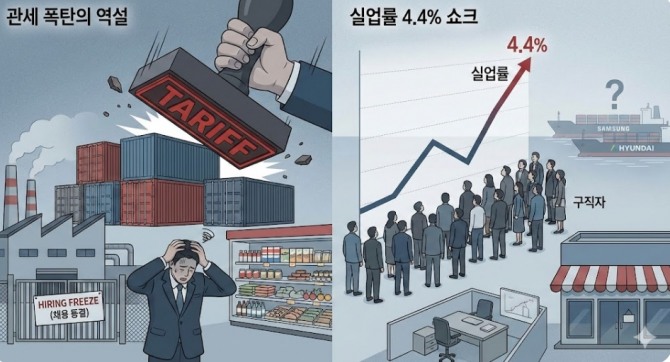 이미지 확대보기미국 CNN 방송은 지난 10일(현지시각) 지난해 미국의 실업률이 4.4%까지 치솟으며, 경기 침체기가 아님에도 수십 년 만에 가장 낮은 고용 성장세를 보였다고 보도했다. 무차별적인 관세 장벽이 소비자 물가보다는 기업의 이익 구조를 훼손해 채용 시장을 얼어붙게 만들었다는 분석이다. 이에 따라 대미 수출 의존도가 높은 삼성전자와 현대자동차 등 한국 기업들에도 '소비 절벽'의 경고등이 켜졌다.