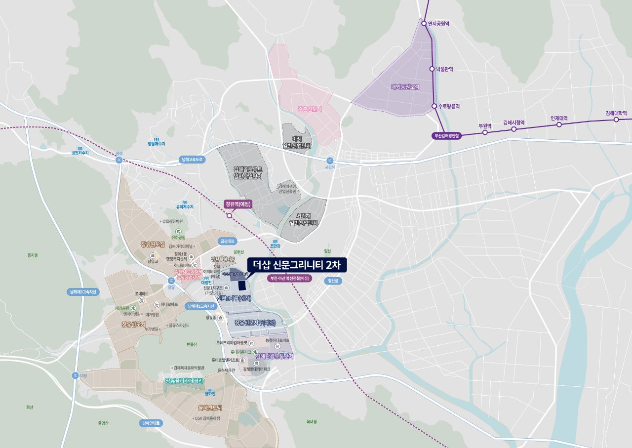 단지가 위치한 신문1지구는 이미 완성된 장유·율하지구와 함께 인근 장유신문지구, 장유무계지구, 김해관광유통단지 조성사업이 완료되면 신도시급 주거벨트로 성장할 전망이다. 또한, 인근 장유역에 부전~마산 복선전철이 개통되면 부울경(부산∙울산∙경남)을 1시간 내에 이동할 수 있는 광역 교통망도 갖출 예정이다.