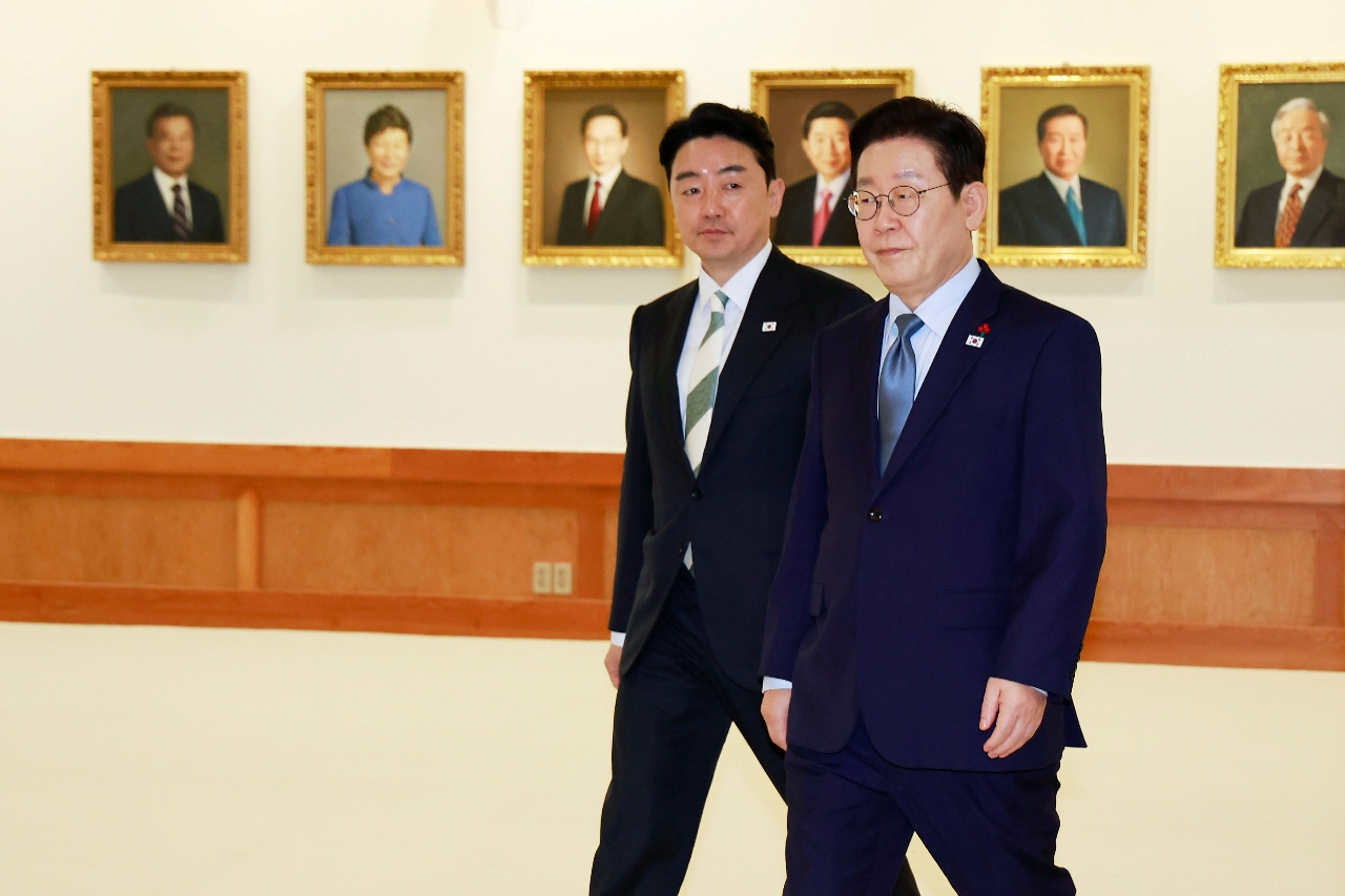 이재명 대통령과 강훈식 비서실장이 15일 청와대에서 열린 수석보좌관회의에 입장하고 있다. 사진=연합뉴스